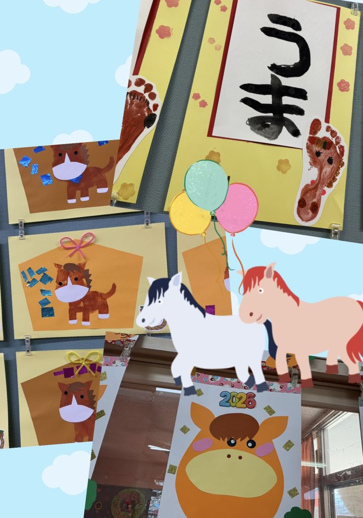 足型スタンプやステンシル、福笑いのようにパーツを貼って干支の午を作りました!