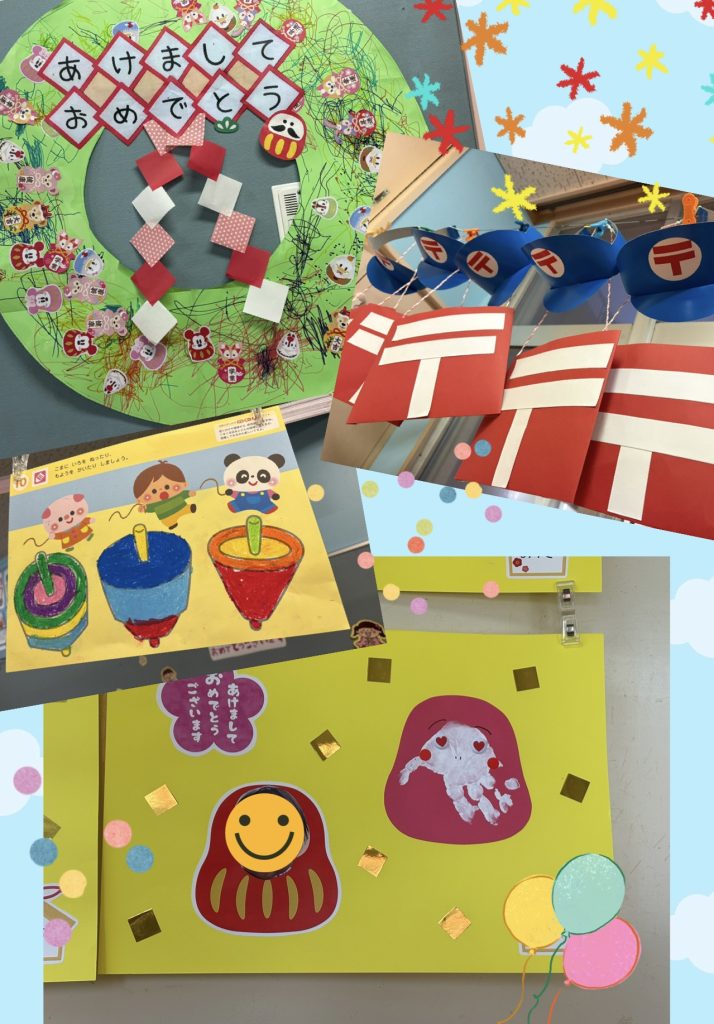 お絵描きで作ったしめ飾り、色塗りを楽しんだコマ、年賀状ごっこや手型スタンプのダルマ作りなど、正月にちなんだ製作をたくさん楽しみました✨